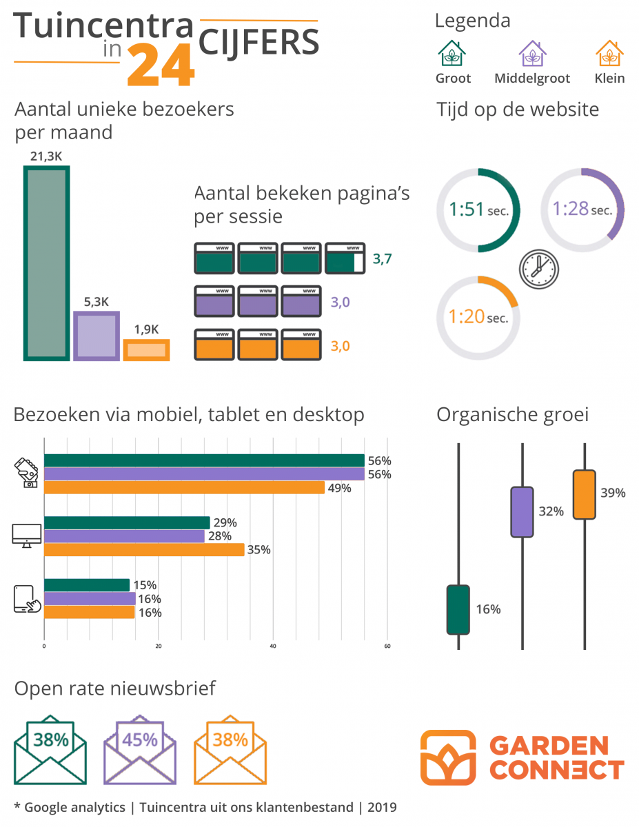 De cijfers in de infographic zijn verdeeld over grote, middelgrote en kleine tuincentra. Het valt meteen op dat het aantal unieke bezoekers per maand bij grote tuincentra met kop en schouders uitsteekt boven de middelgrote en kleine tuincentra. Dit kan verschillende oorzaken hebben, bijvoorbeeld het feit dat de grote tuincentra meer budget hebben voor advertenties en paid search, waar kleinere tuincentra vooral gebruik maken van (gratis) organische zoekmachine optimalisatie. Per sessie worden er bij grote tuincentra meer pagina’s bekeken, gemiddeld zo’n 3,7. Bij middelgrote en kleine tuincentra is dit een gelijk gemiddelde van 3 pagina’s. Dit kan ook mede komen door de opzet van de website. Bij kleinere tuincentra kan dit wat minder gedetailleerd zijn opgezet, waardoor de bezoeker sneller klaar is met lezen en doorklikken. Dat is ook terug te zien aan de tijd die de bezoekers doorbrengen op de website. Gemiddeld is dat bij grote tuincentra 1 minuut en 51 seconden, waar middelgrote tuincentra en kleine tuincentra dichter bij elkaar liggen met 1 minuut en 28 seconden en 1 minuut en 20 seconden.