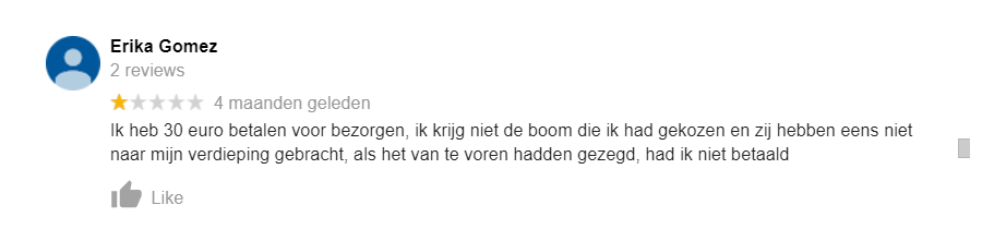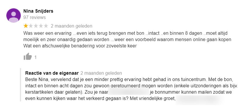 Veel negatieve reviews komen voort uit slechte communicatie. Zie hieronder bijvoorbeeld de review van iemand over een online aankoop bij een tuincentrum: