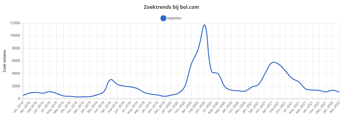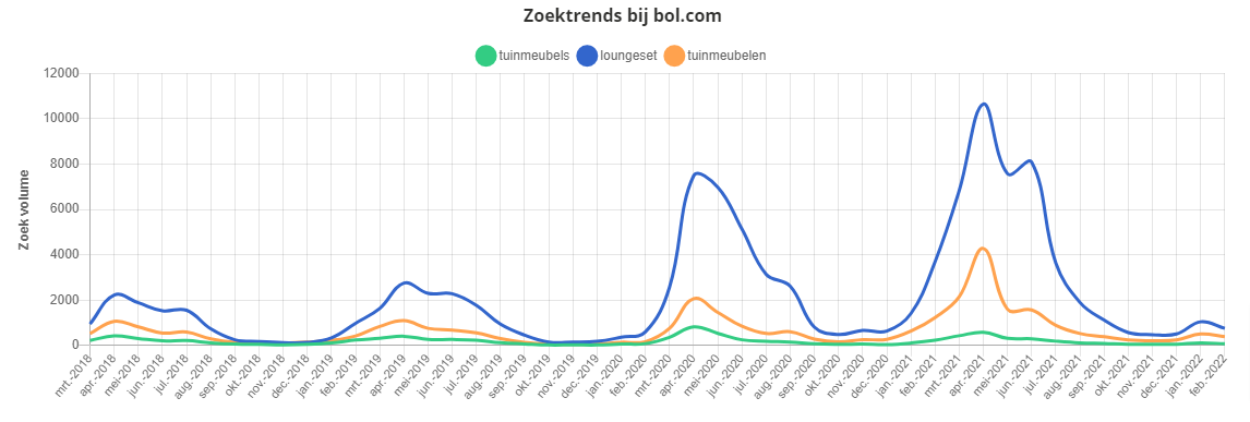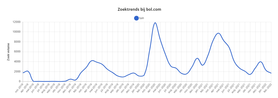 Dat Bol.com groot is in tuinartikelen wisten we al. Je ziet de stijging van ca. 2.000 zoekopdrachten als piek in april 2018 naar ruim 4.000 in 2019, dat is een mooie verdubbeling. Dankzij de Corona lockdown explodeerde het aantal opdrachten naar 12.000 in 2020. Ook in 2021 blijft het aantal zoekopdrachten hoog en de vraag is natuurlijk of deze zoektrend in 2022 ook doortrekt: