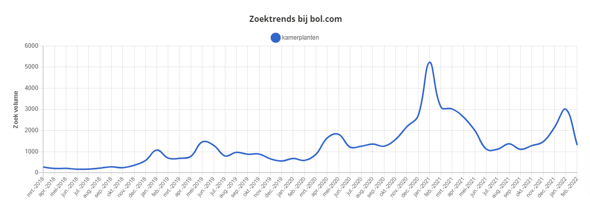 De kamerplanten zoektrend gaat ook niet voorbij aan Bol.com. Zoals je hieronder kunt zien is het aantal zoekopdrachten beperkt tot 2018, maar daarna gaat men ook op Bol.com op zoek naar kamerplanten. De piek van kamerplanten ligt echter een stuk later: pas vanaf januari 2021 zijn consumenten flink gaan zoeken naar kamerplanten op Bol.com.