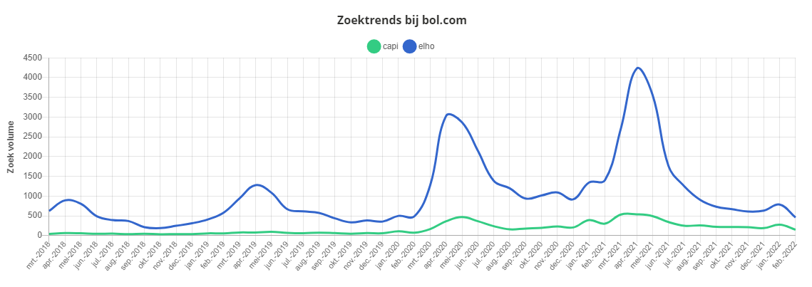 Deze leveranciers zitten naast elkaar in Tilburg en verkopen over de hele wereld binnen- en buitenpotten: Elho en Capi. De tweestrijd wordt beslecht in het voordeel van ELHO want die trekken duidelijk meer zoekopdrachten volgens de zoektrends van Bol.com: