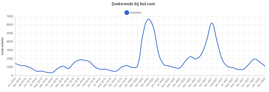 De interesse in moestuinieren is in onze beleving de afgelopen jaren flink gestegen, mede dankzij de trend om ‘lokaal’ voedsel te eten en de give-away Moestuintjes van Albert Heijn. Mede daarom waren we verbaasd dat deze trend pas laat op gang komt bij Bol.com. Pas bij de Corona piek is er sprake van een stijging te zien bij de zoektrends: