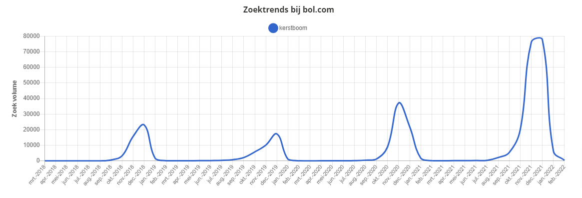 Bol.com is flink in deze markt gestapt en verkoopt échte kerstbomen. In 2018 zochten 24.000 consumenten naar kerstbomen maar in 2022 is dit aantal ruim 300% gestegen tot 80.000 zoekopdrachten. De zoektrend van Bol.com hieronder laat een mooie ontwikkeling zien: het volume in 2019 was lager dan in 2020, maar in 2021 & 2022 piekt het weer.