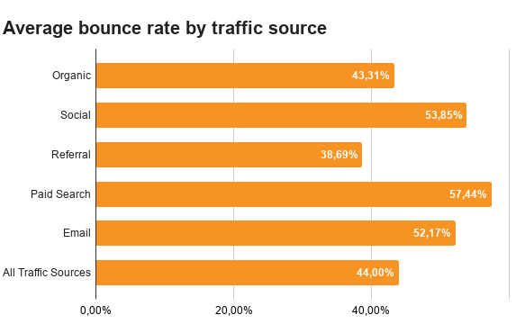 Dat gezegd hebbende is het goed om te weten dat Google Analytics je per verkeersbron het bouncepercentage kan laten zien. Hier zijn de resultaten per verkeersbron van de 21 websites die wij bekeken hebben:
