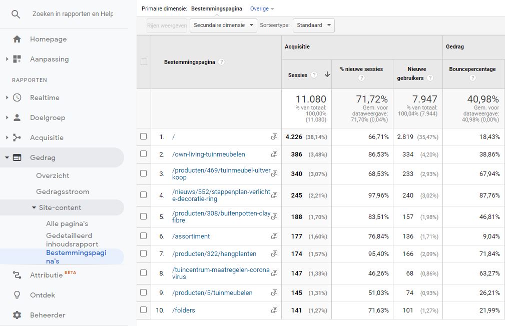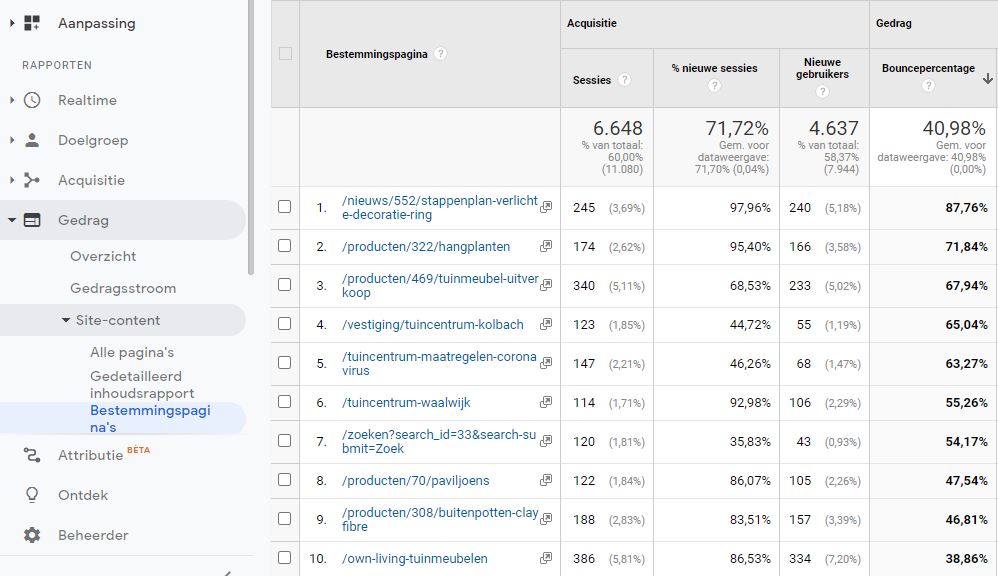 De pagina die eruit springt is, in dit voorbeeld, de “Tuinmeubel uitverkoop" pagina op rij 3. 340 bezoekers belandden op deze pagina en 67,94% verliet de website meteen weer. Aangezien het gemiddelde bouncepercentage 40,98% is springt deze pagina er negatief bovenuit. Het verbeteren van deze pagina zal het totale bouncepercentage sterk verminderen en is een goed idee.