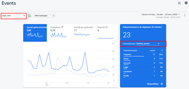 Het is natuurlijk ook nuttig om te weten welke pagina’s binnen de app gebruikers zoal bekijken. Ga daarvoor naar Events en kies voor “Page views”. Het is belangrijk om de parameternaam rechts op “firebase_screen” te zetten: