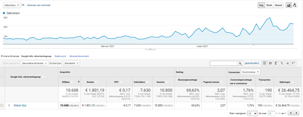 Voor één van onze buitenlandse klanten hebben we dit voorjaar een campagne opgezet om barbecues te promoten. Zo zie je dat hij €1.801,19 heeft uitgegeven voor 7.630 bezoekers. Zij hebben €26.464,75 besteed in zijn webshop en 190 aankopen gedaan: