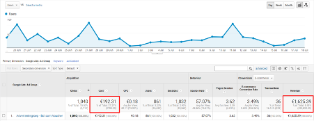 Zoals je in het screenshot kunt zien heeft dit €1.625 aan extra omzet opgeleverd. Maar dat zal niet het enige zijn, want er zijn 1.040 bezoekers op de website geweest en sommigen van hen zullen naar het tuincentrum zijn gegaan.
