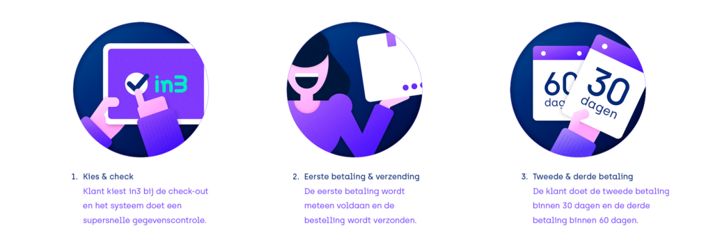 De consument betaalt direct het eerste deel van de bestelling (deel 1 van 3). Het tweede deel moet na 30 dagen betaalt worden, het laatste deel van 60 dagen. Maar jij hoeft je daarover geen zorgen te maken want na het afronden van de bestelling neemt In3 de communicatie over de betaling van je over. Jij kunt je bestelling zorgeloos uitleveren want In3 garandeert de uitbetaling aan jou - ook als de consument niet tijdig betaalt aan In3.