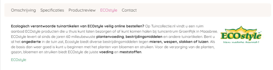 De tweede truc die weinig wordt toegepast in tuincentra webshops is het toevoegen van een product tab met informatie over het merk: