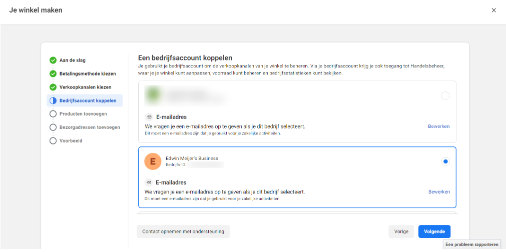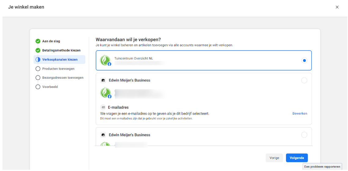 In de volgende stap moet je de account kiezen waarmee je je verkoopkanalen wilt beheren. Meestal zie je daar gewoon 1 zakelijk Facebook account staan. Zie je er meerdere, kies dan degene die hoort bij het verkoopkanaal wat je in de vorige stap hebt gekozen: