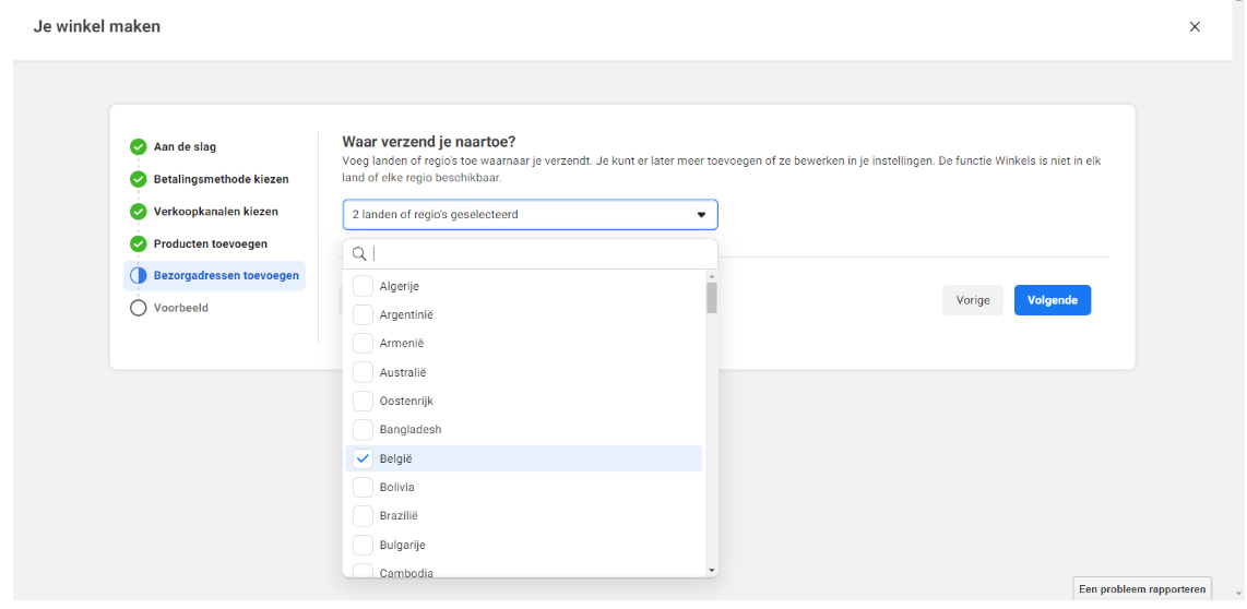 Je moet ook aangeven naar welke landen je producten levert. Je kunt er meerdere kiezen en in dit geval kiezen we voor Nederland & België:
