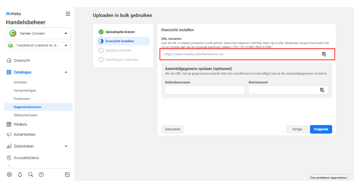 Je moet nu de link naar het artikelbestand invoeren. Dit is doorgaans een XML-feed. Je kunt deze zelf aanmaken in het Garden Connect platform: zo bepaal je precies welke producten je wel of niet wilt koppelen.