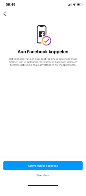 Je Instagram account wordt dan overgezet van een privé account naar een bedrijfsacount. Doorloop de stappen en zorg ervoor dat je je Facebook account aan Instagram koppelt: