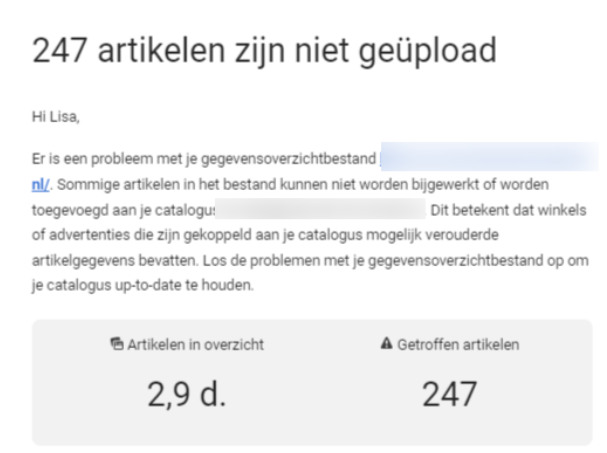 Zodra je de productfeed van je webshop koppelt aan Handelsbeheer zul je merken dat je soms mails krijgt dat producten niet verwerkt kunnen worden. Deze mail ziet er bijvoorbeeld als volgt uit: