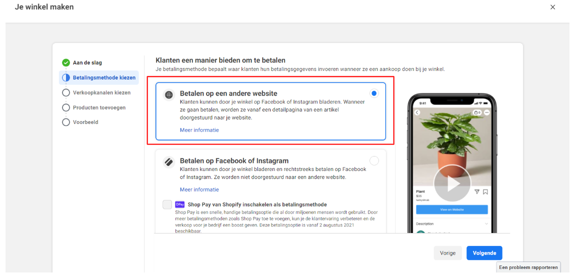 Vervolgens krijg je de vraag om te kiezen hoe klanten bij jou gaan betalen. Omdat je voor jouw tuincentrum een eigen webshop hebt, kies je hier voor “Betalen op een andere website”: