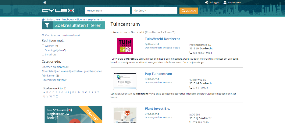Een leuke bijkomstigheid is dat complete, actuele vermeldingen vaak beter getoond worden in bedrijvengidsen. Op die manier krijg je dus óók extra aandacht. Als je in Cylex zoekt naar tuincentra in de buurt van Dordrecht, dan staat Tuinwereld ook bovenaan: