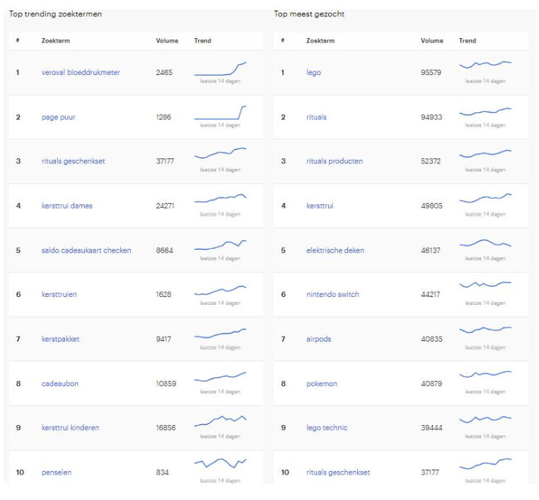 Links zie je zoekwoorden die op dit moment trending zijn. Hier kun je als verkoper makkelijk op inspelen, aangezien er nog niet veel aanbieders van deze producten zullen zijn. Rechts zie je de meeste gezochte items. Woorden rondom Rituals en lego staan eigenlijk altijd wel in de top-10. Afhankelijk van het seizoen, kom je hier ook andere product(groep)en tegen.