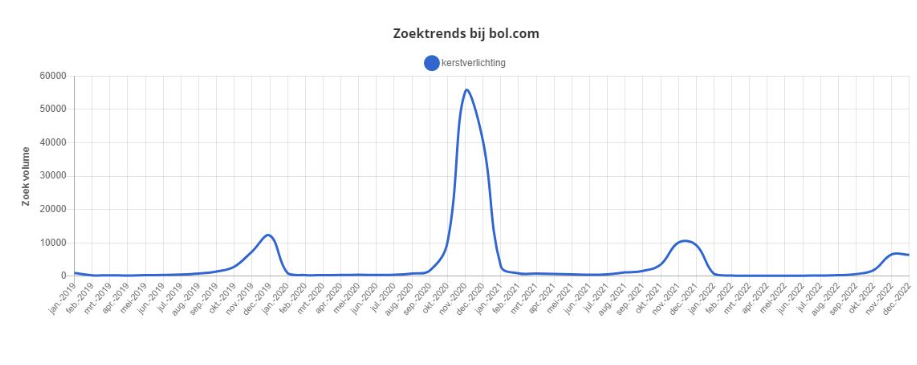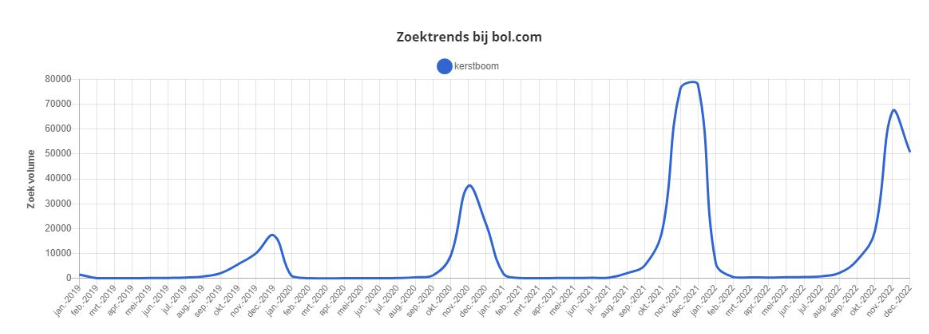 Bol.com is sinds 2019 ook een erkende speler in de verkoop van echte kerstbomen. In 2019 zochten ruim 17.000 consumenten tijdens de piek in december naar kerstbomen, maar in 2022 is dit aantal bijna verviervoudigd. De zoektrend van Bol.com laat een mooie ontwikkeling zien: het volume in 2019 was lager dan in 2020, maar in 2021 & 2022 piekt het weer. Zet deze trend ook door in 2023?
