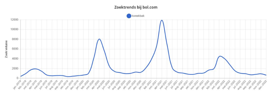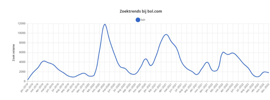 Bol.com biedt een groot aanbod aan verschillende soorten tuinartikelen. Populaire zoekwoorden omtrent tuin zijn onder andere, tuinslang, tuintafel, tuinset, tuinbank, tuinverlichting, tuinverlichting op zonne-energie, tuinstoelen, tuinkast en tuinposter. In onderstaande tabel zie je een overizcht van de zoekopdrachten rondom het woord tuin van de afgelopen vier jaar. Het aantal zoekopdrachten explodeerde van 4.000 in 2019 naar 12.000 in 2020. Ook in 2021 bleef het aantal zoekopdrachten hoog (met een piek van bijna 10.000). De tuin was iets minder booming in 2022 met een piek van rond de 6.000 zoekopdrachten. Weet wel dat we in 2018 rond de 2.000 zoekopdrachten zaten. De tuintrend zet zich dus duidelijk door, dan wel in een iets minder extreme mate.