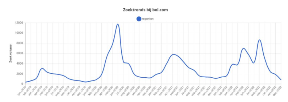 Bij de Bol.com zoektrends zien we duidelijk dat de vraag naar regentonnen door de Corona-periode op gang is gekomen. De piek is dan wel niet zo hoog als die in 2020, maar het bewustzijnsplantje is zeker geplant.