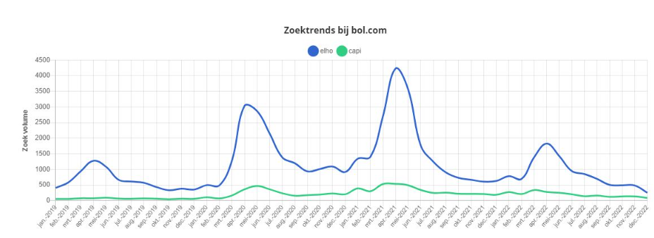 Elho en Capi zijn twee populaire leveranciers in de tuinbranche. Werkelijk elk tuincentrum in Nederland verkoopt wel artikelen van één of beide merken. Deze leveranciers zitten naast elkaar in Tilburg en verkopen over de hele wereld binnen- en buitenpotten: elho en Capi. De tweestrijd wordt beslecht in het voordeel van elho, want die trekken duidelijk meer zoekopdrachten volgens de zoektrends van Bol.com: