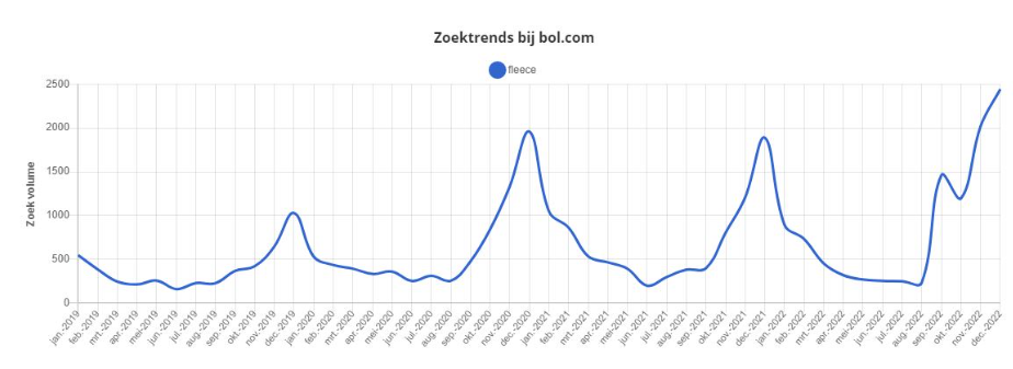 Nooit eerder waren de energieprijzen zo hoog. Niet gek dus dat men op zoek gaat naar alternatieve, goedkopere manieren om zichzelf warm te houden. Het zoekwoord fleece is daarom populairder dan ooit. Met een fleece deken, fleece trui of fleece plaid houd je jezelf lekker warm zonder dat je de kachel direct op 20 graden hoeft te zetten. In de tabel van afgelopen vier jaar zie je dat er rond november tot en met januari altijd een piek was, maar de piek van 2022 was immens hoog en stijgt nog steeds! Laten veel van onze tuincentra nu net een mooi assortiment fleece dekens en fleece truien aanbieden. Dit is waarschijnlijk een trend die, zolang de gasprijzen nog stijgen, bij ons blijft.