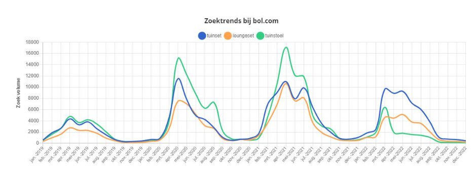 39% van de tuinmeubels in Nederland wordt online gekocht. Bol.com speelt ook daarin een rol. In deze grafiek zie je de populariteit van tuinset, loungeset en tuinstoel. Zoals je ziet in de Bol.com zoektrends, won de tuinstoel het in 2020 en 2021 gemakkelijk op volume. In 2022 zien we echter dat de tuinset veel populairder is. Als je uitgaat van €500 (minimaal) voor een basic tuinset dan kun je je voorstellen dat verkopers heel wat omzet draaien op Bol.com.