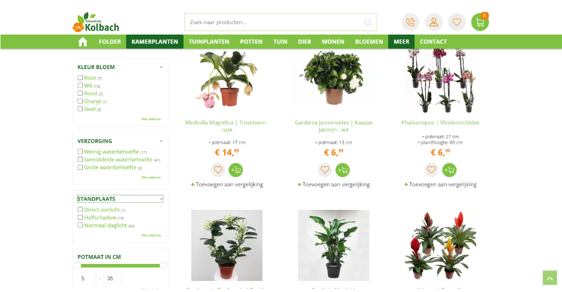 Bij Tuincentrum Kolbach worden bloeiende kamerplanten gefilterd op bloeikleur, waterbehoefte en standplaats: