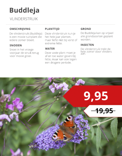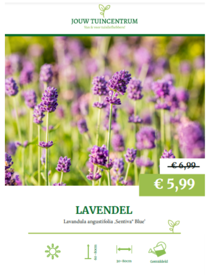 Deze informatie is precies wat jouw klanten nodig hebben als ze in jouw tuincentrum zijn. Hieronder zie je een voorbeeld van een effectief prijsbordje waarbij alleen de hoogst noodzakelijke informatie opgenomen is: